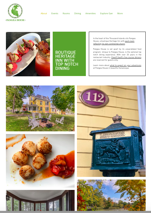 I opened Pangea House, a new Heritage Inn in Gananoque, Ontario during the COVID-19 global pandemic. I developed a new brand identity (and worked with a graphic designer to produce a logo and brand handbook), created and administered a communications and marketing strategy, designed and managed digital platforms (website, email marketing, social media), directed sales, and advanced public and private sector partnerships.